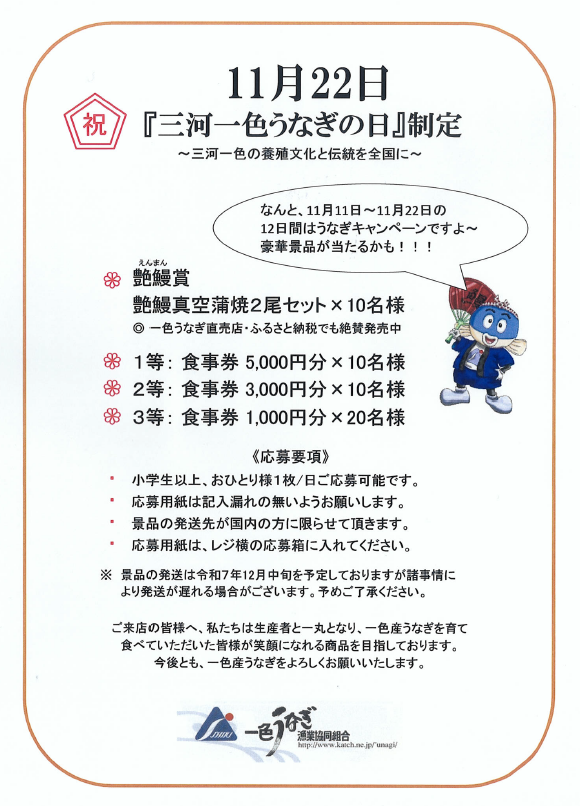 | 2025/11/11 | 『三河一色うなぎの日』制定 11月11日(火)から11月22日(土) ★豪華賞品の当たるキャンペーンを開催★ それに伴い、キャンペーン期間中は【艶鰻】を提供いたします。 この機会にぜひご来店ください。 |